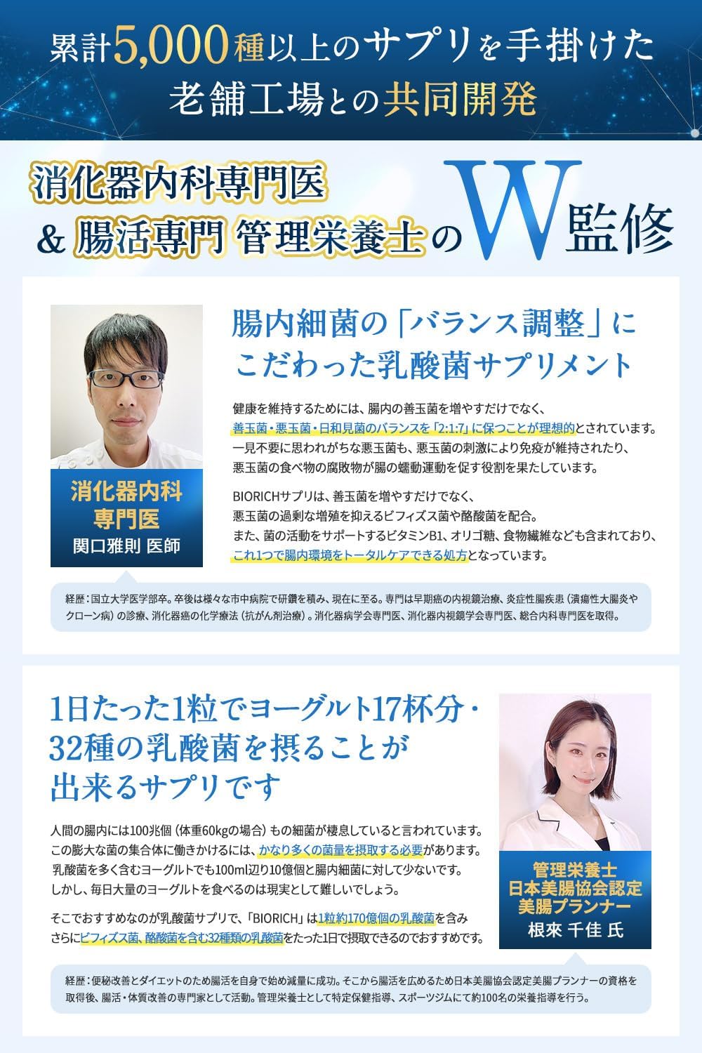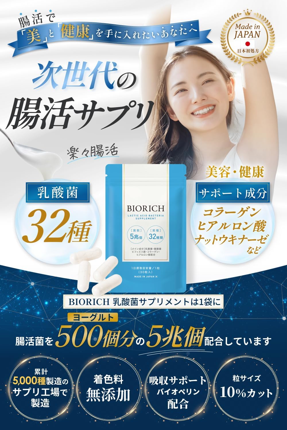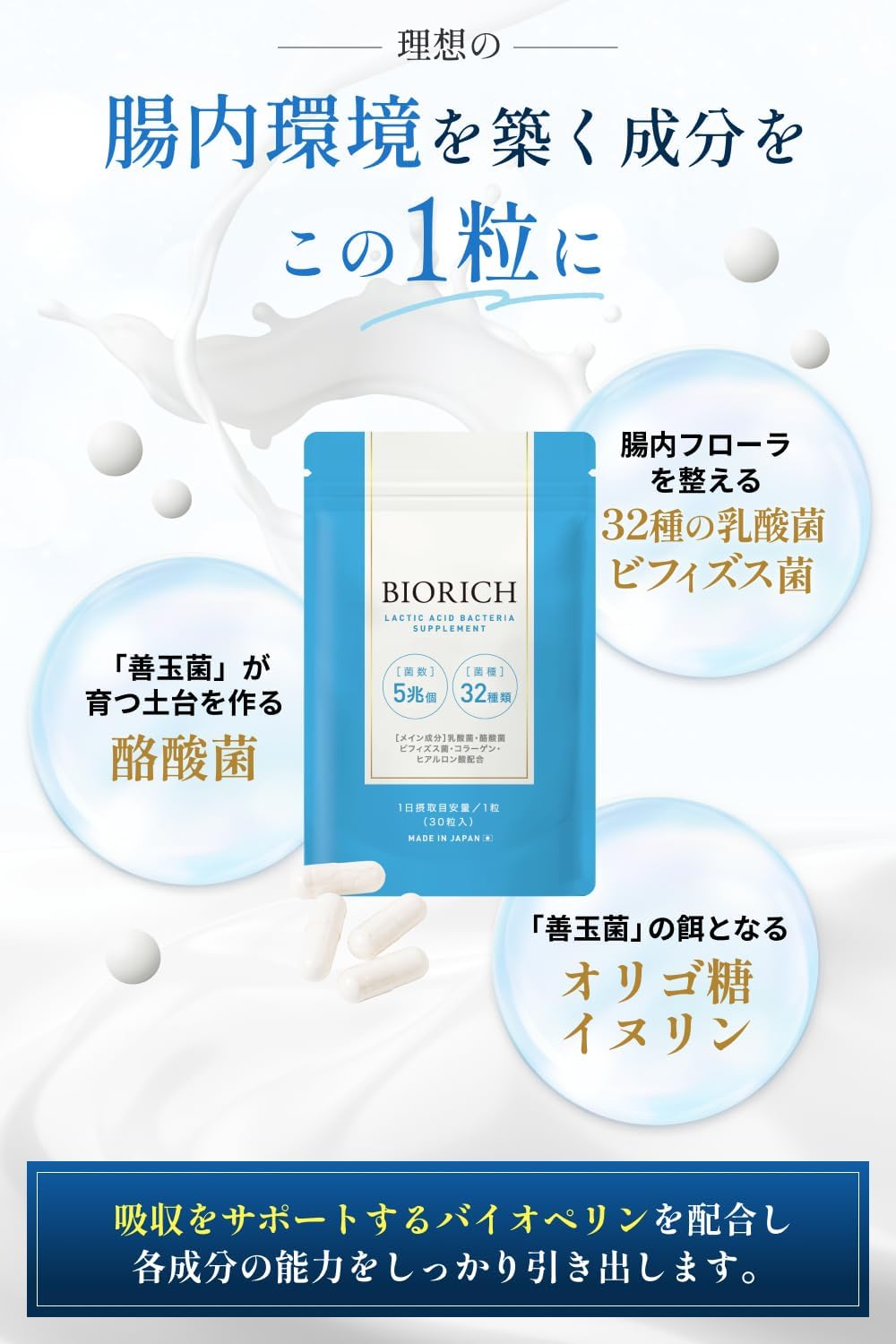 - 【32種の乳酸菌を配合】BIORICH乳酸菌サプリには「32種の活性菌」を配合しており、「シールド乳酸菌M-1」「シンデレラ乳酸菌」「乳酸菌nanoECF」「FK-23菌株」などを1日1粒(目安)で手軽に摂取できます。