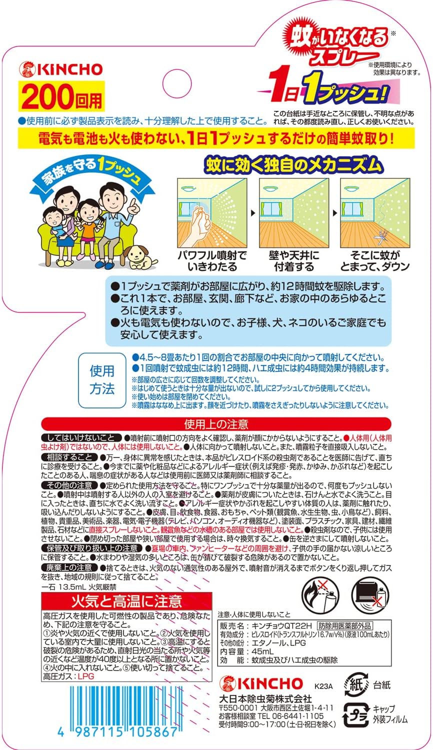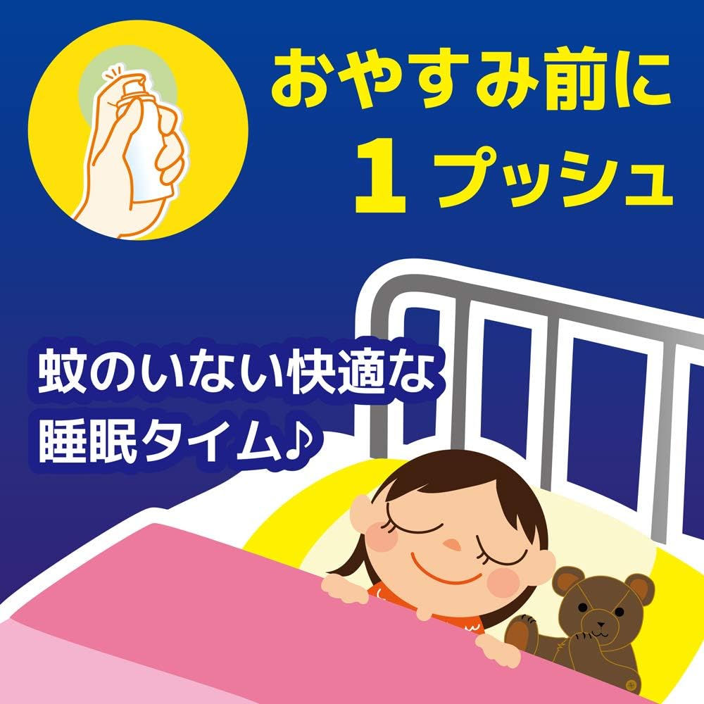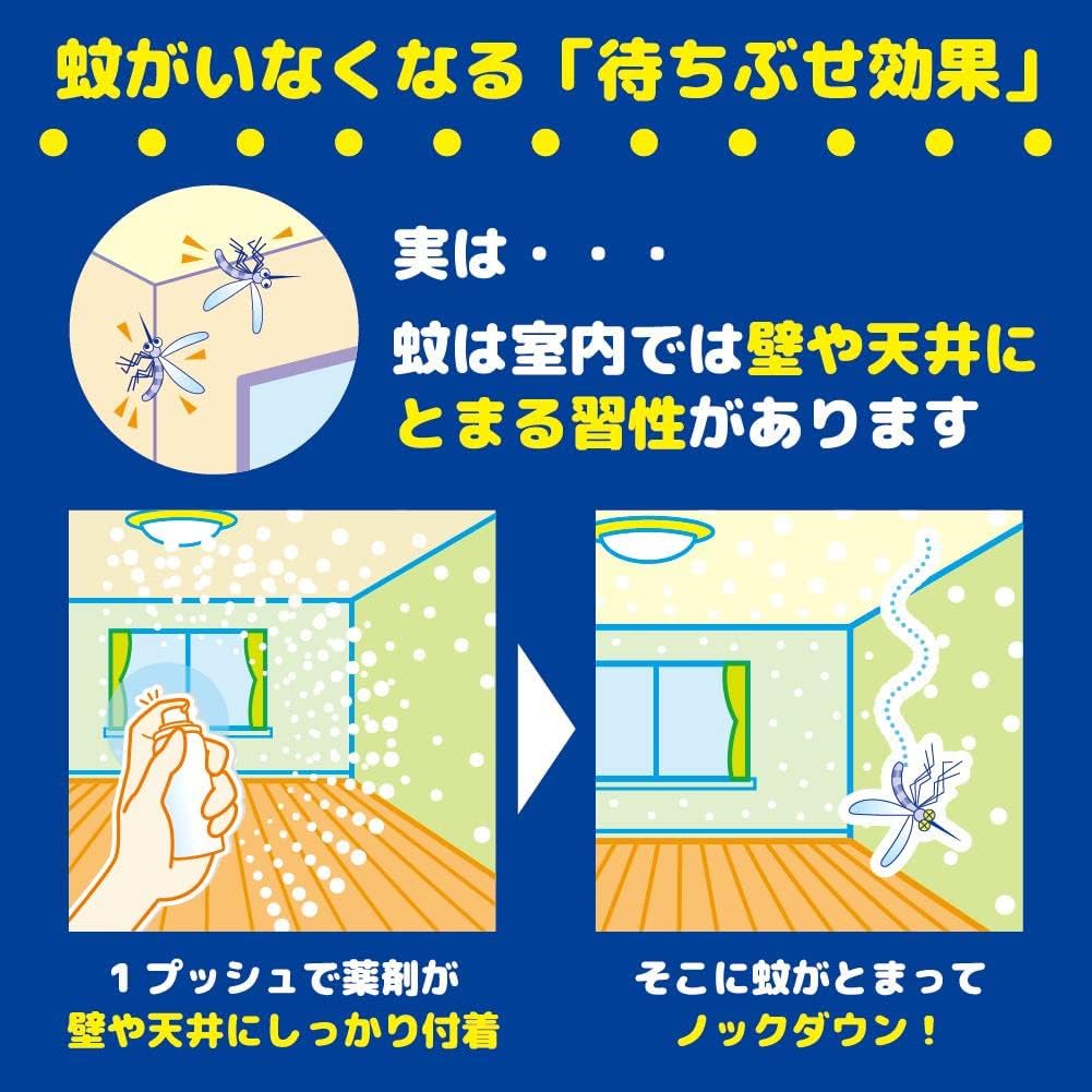 - 【特徴】●蚊の駆除効果が約12時間持続するワンプッシュタイプのスプレー。●4.5~8畳に1プッシュするだけで、壁や天井に薬剤が付着し、そこにとまった蚊を駆除します。●これ1本で、お部屋、玄関、廊下など、お家の中のあらゆるところに使えます。●ハエへの効果は約4時間持続。